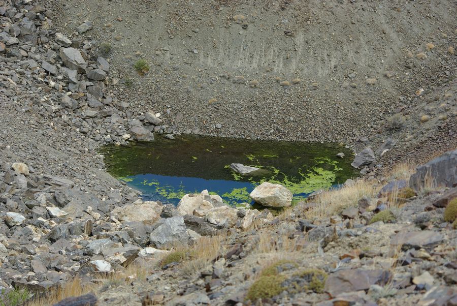 Река Азинташ течет на поверхности последние несколько сотен метров. Выше — огромная осыпная долина, вода течет где-то внизу под камнями, не видно и не слышно.